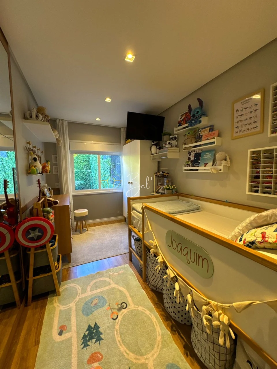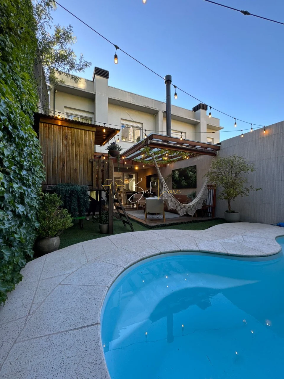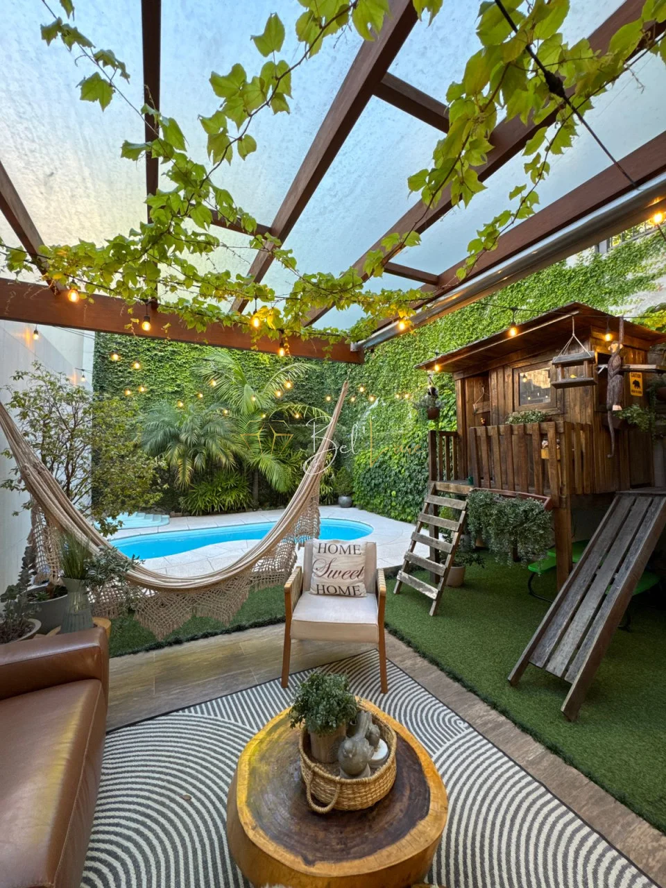 O imóvel possui três quartos, sendo uma suíte. A área gourmet é completa, com churrasqueira, estar externo e piscina aquecida. O pátio conta com uma casinha infantil que traz ainda mais charme ao espaço.