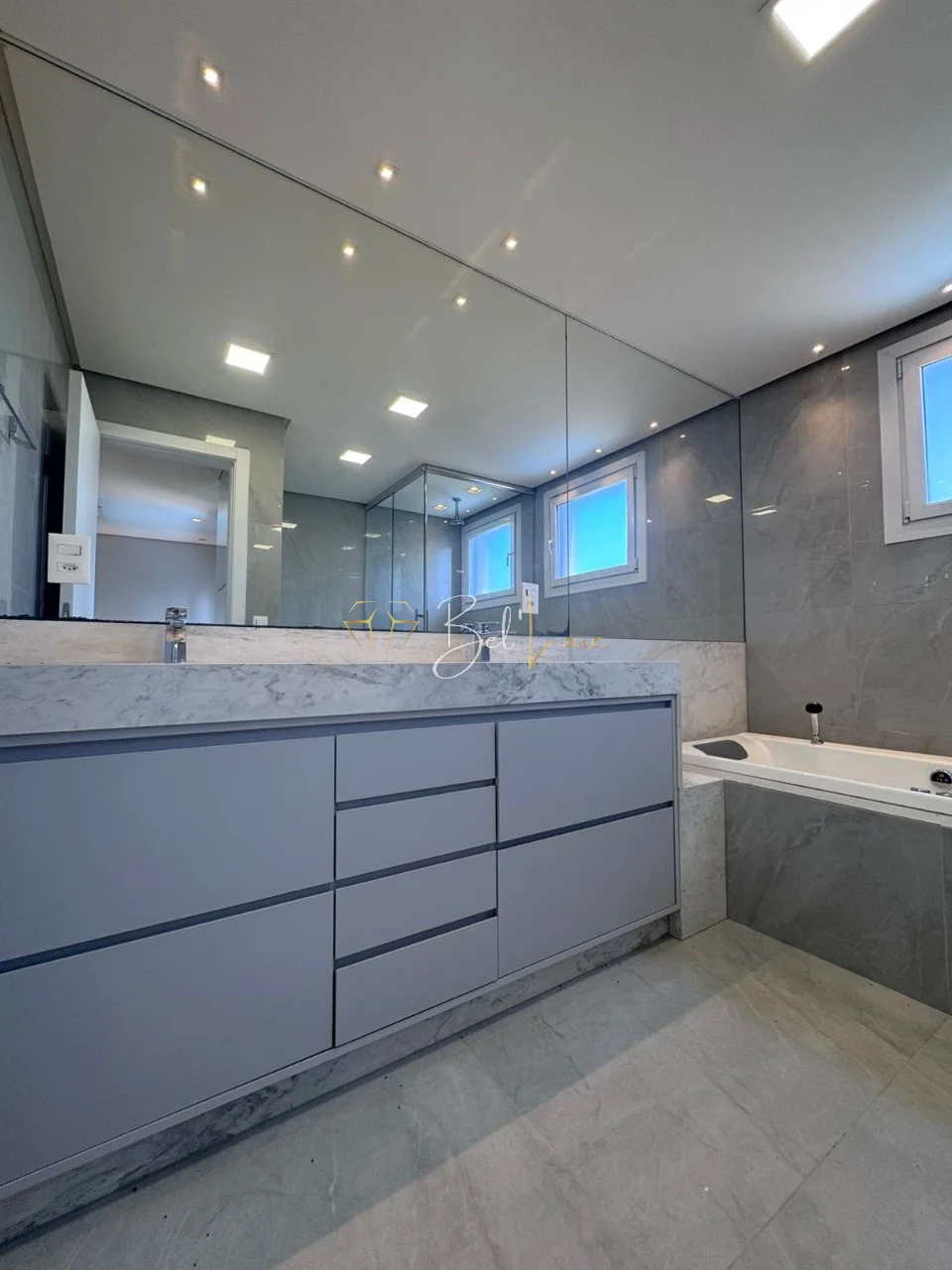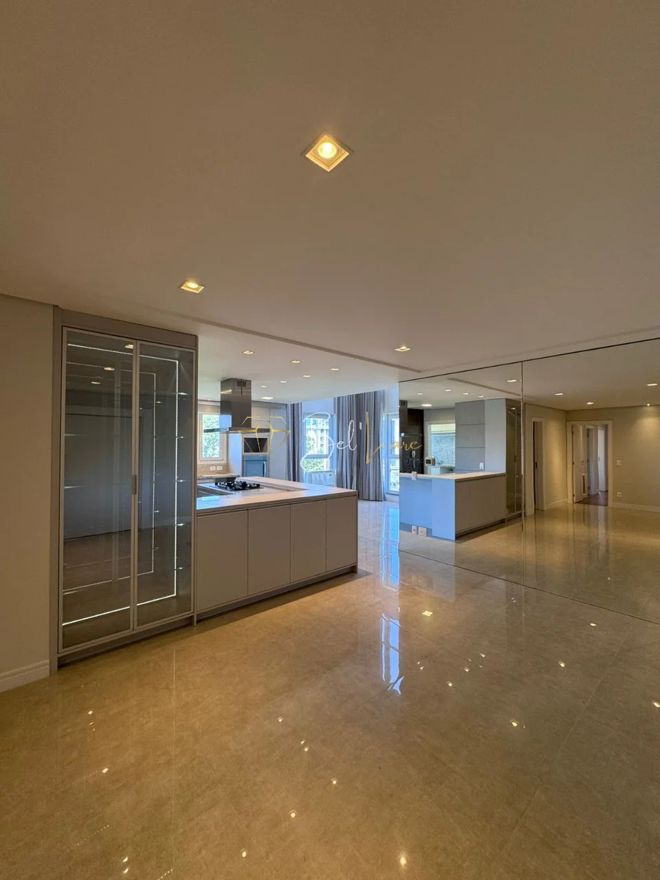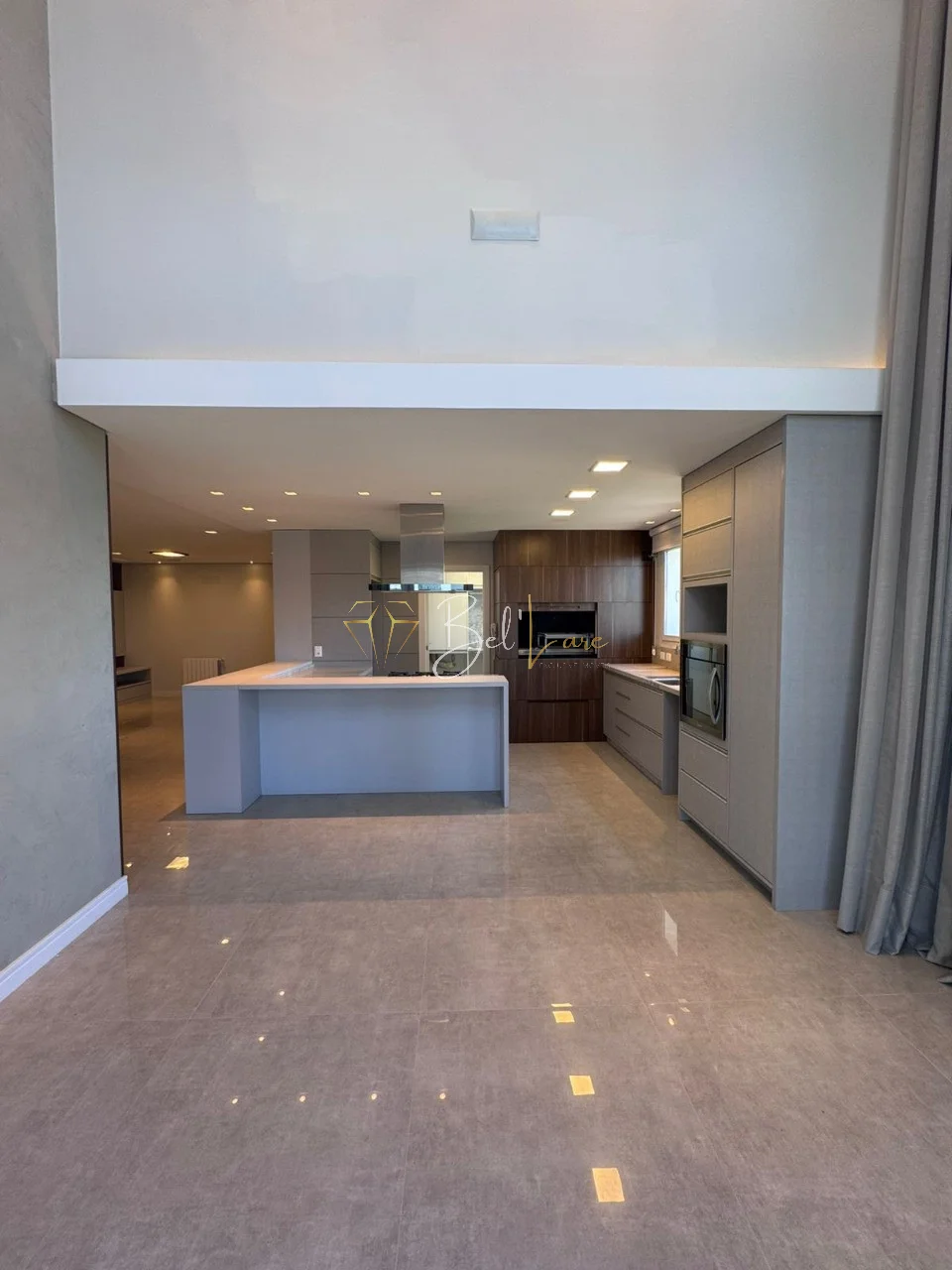 O living imponente acomoda três ambientes com elegância. A sala de estar possui pé-direito duplo, proporcionando amplitude e iluminação natural. A cozinha americana conta com churrasqueira e bifeteira, integrada à sala de jantar. O imóvel ainda oferece um segundo estar social com lavabo e área de serviço com sacada auxiliar.