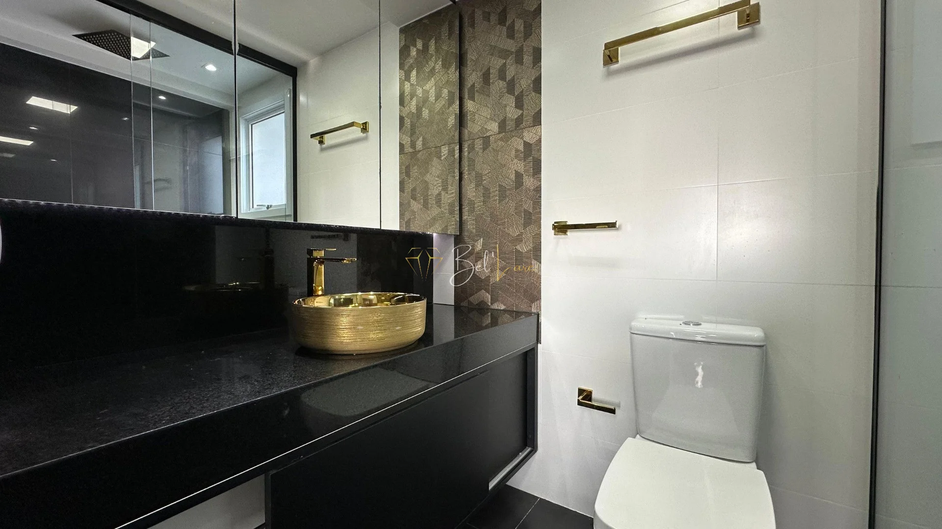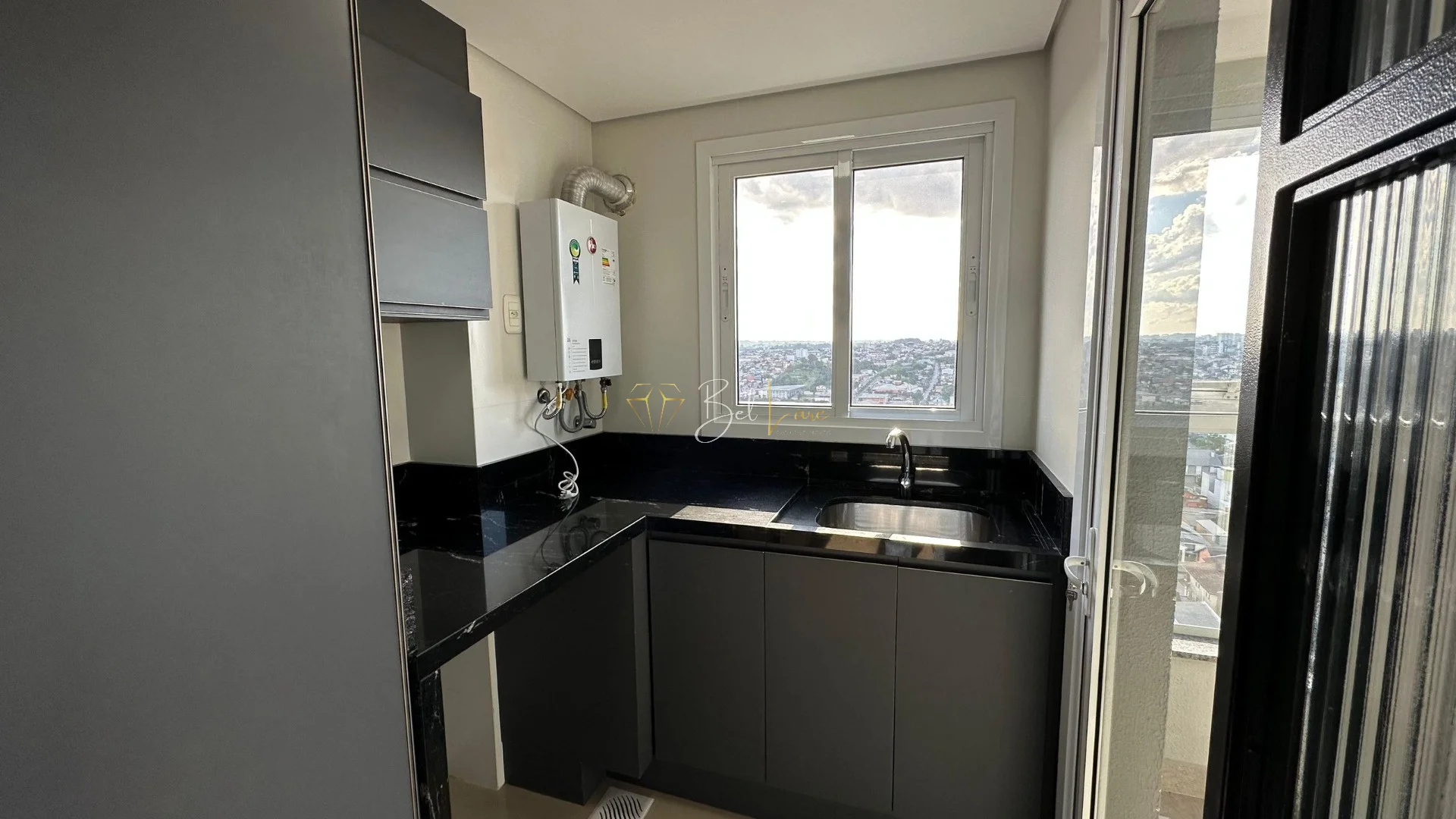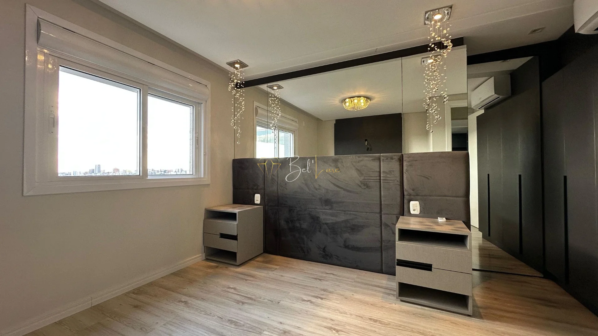 Acabamentos incluem forro de gesso, esquadrias em alumínio branco com persianas motorizadas, piso em porcelanato e laminado, além de esperas para água quente e split.