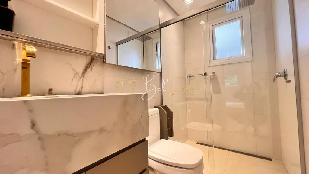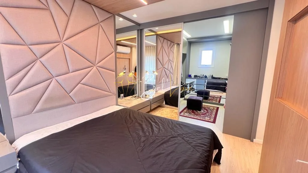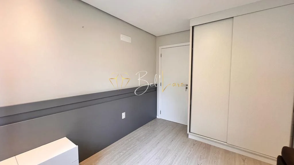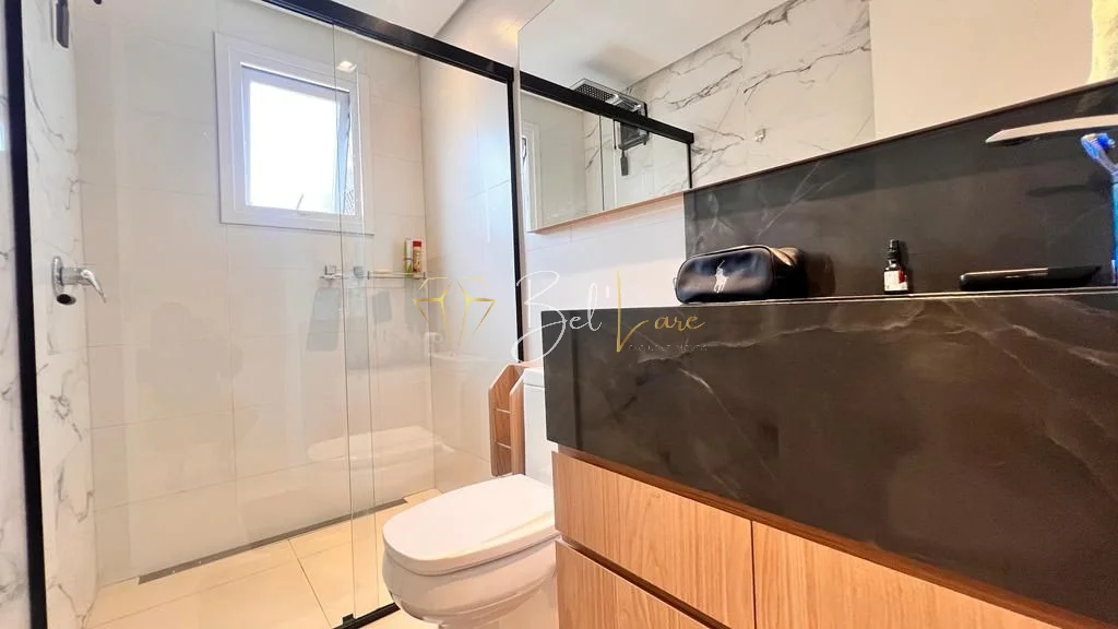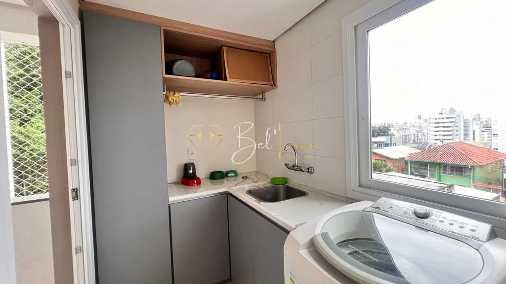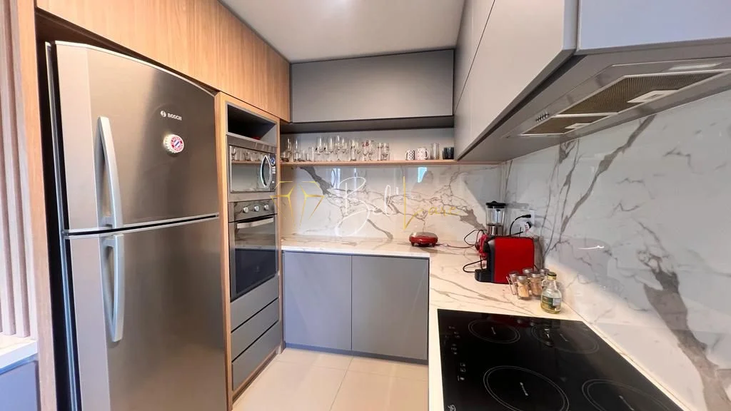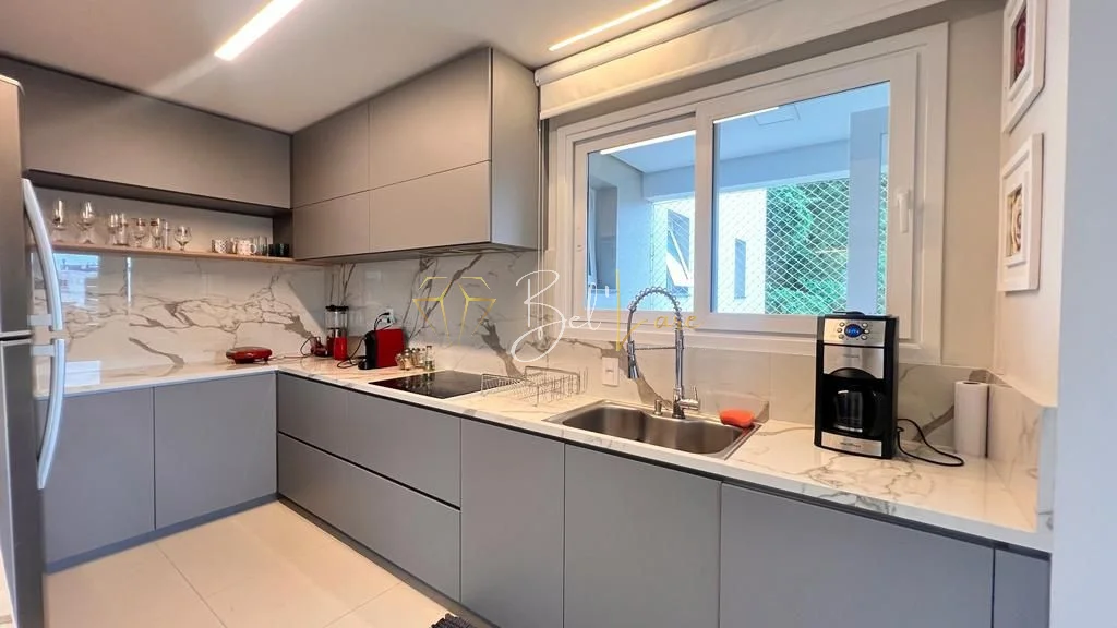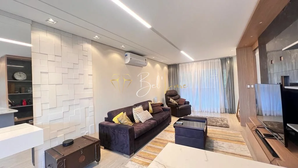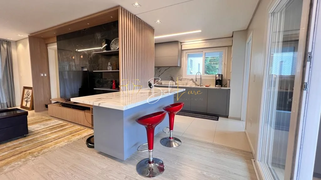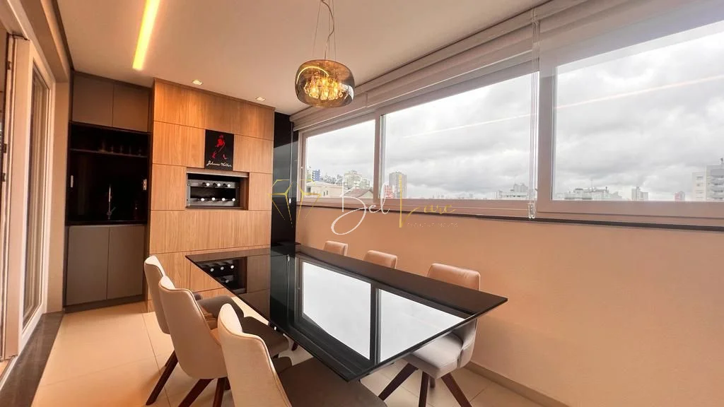 São três quartos, sendo uma suíte com closet. A cozinha é americana e integra-se ao living de dois ambientes, que conecta às sacadas. A sacada gourmet é ampla, fechada em vidro sistema reiki e conta com churrasqueira, além de ser voltada para a rua principal. O imóvel possui lavabo, área de serviço independente com sacada de apoio e banheiro social. Conta também com forro de gesso, iluminação instalada em todo o apartamento, esquadrias em PVC branco, piso porcelanato e laminado.