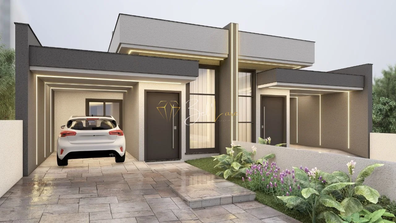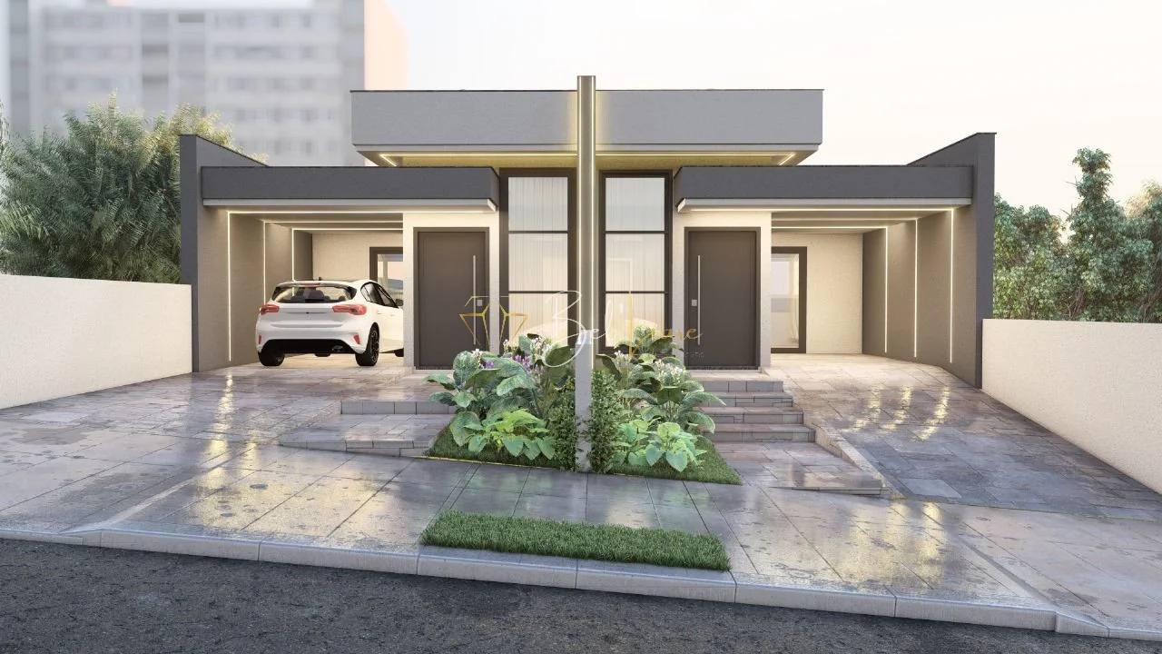 Possui três dormitórios, sendo uma suíte ampla. Sala, cozinha e área de serviço são individuais. Conta com churrasqueira, dois banheiros, frente oeste e duas vagas de garagem.