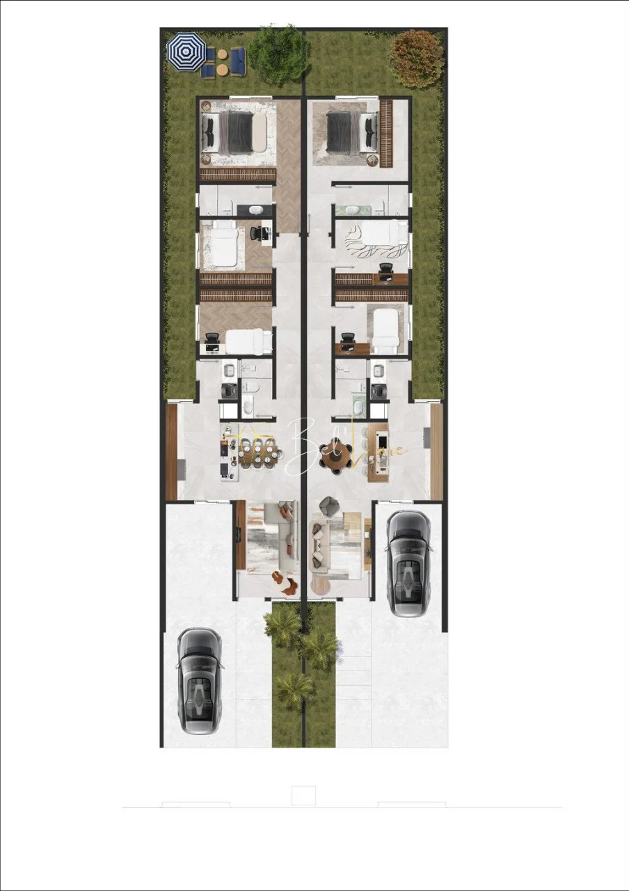 Entre os destaques, estão gessos com detalhes e sancas, iluminação externa em LED, espera para split, esquadrias em alumínio, cercamento completo em gradil e vidro, porcelanato e piso laminado ou vinílico nos dormitórios, massa corrida nas paredes e paisagismo.