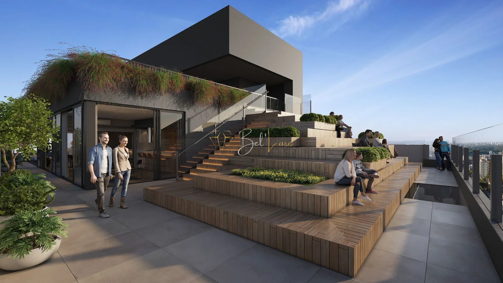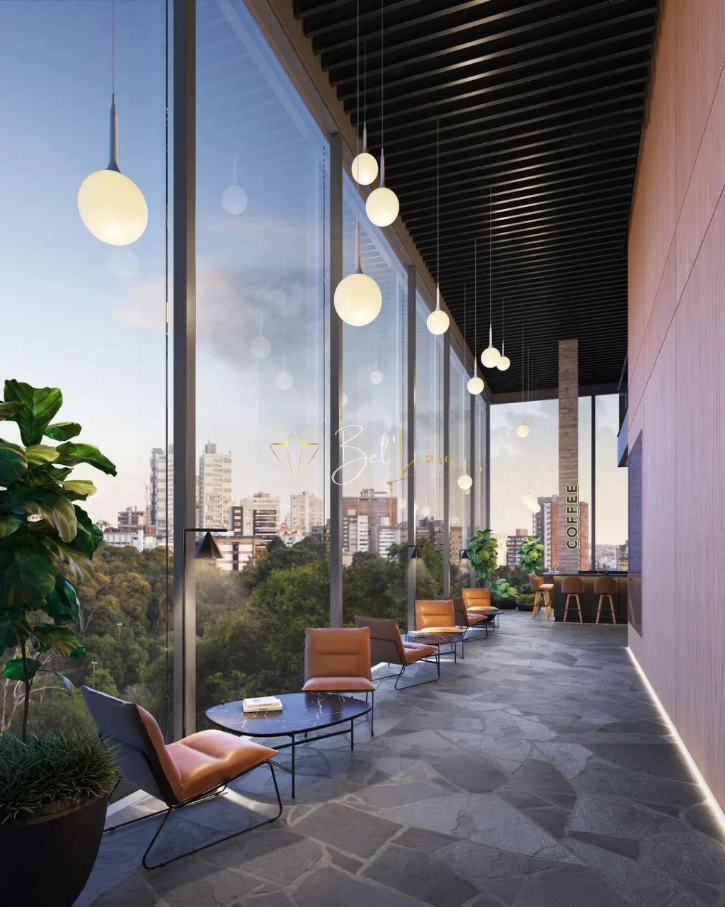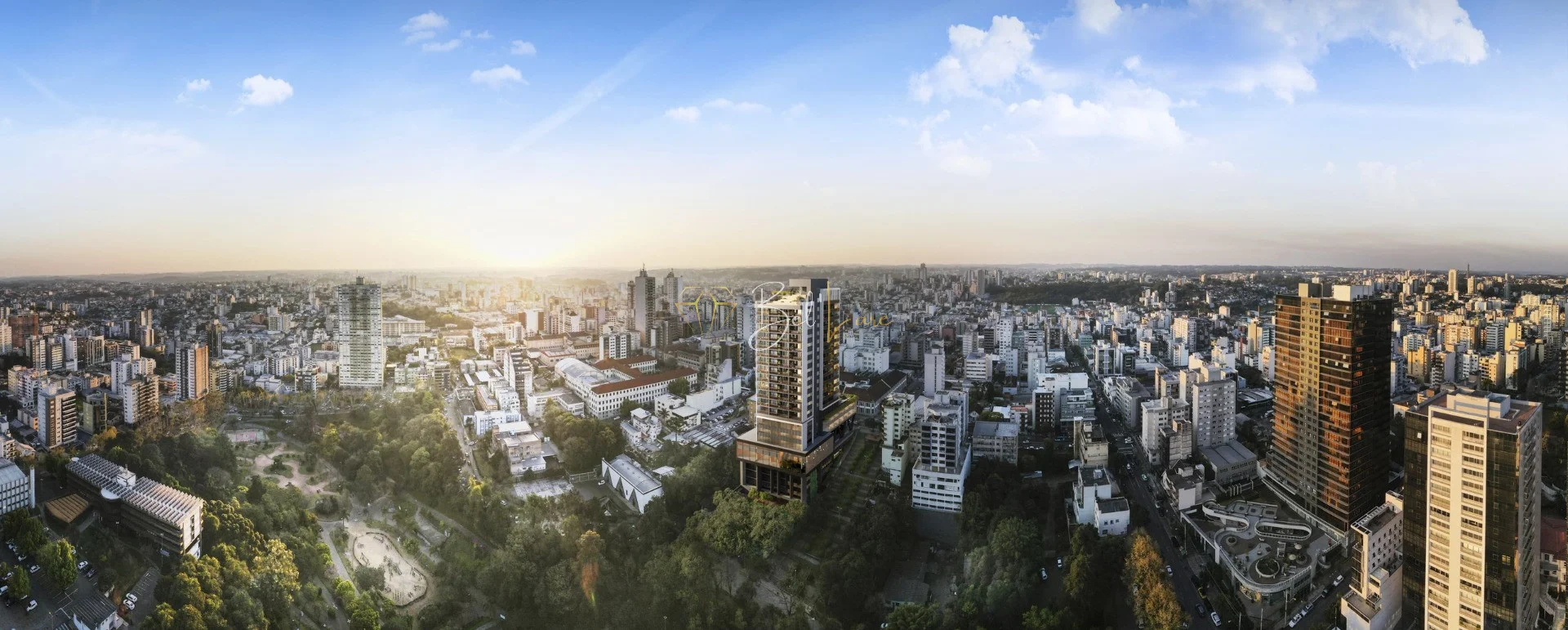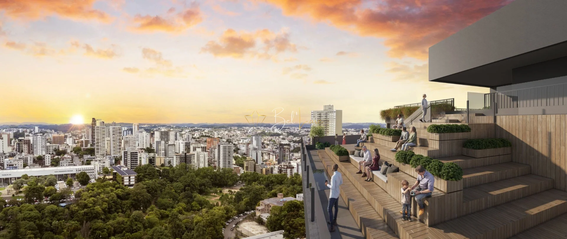 Arquibancada com vista para o Parque Getúlio Vargas e o pôr do sol. Lounges com lareira, home office e terraços. Mirante de vidro e vista panorâmica. Espaços gourmet integráveis e confortáveis ambientes de convívio. Lavanderia equipada. Terraços externos.