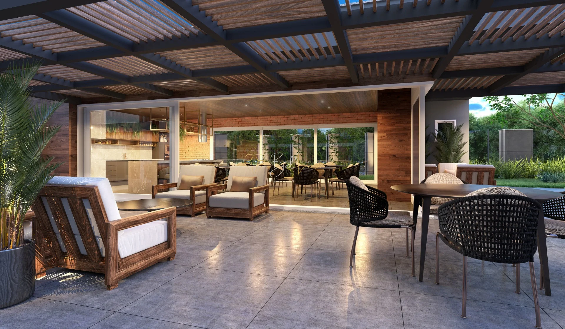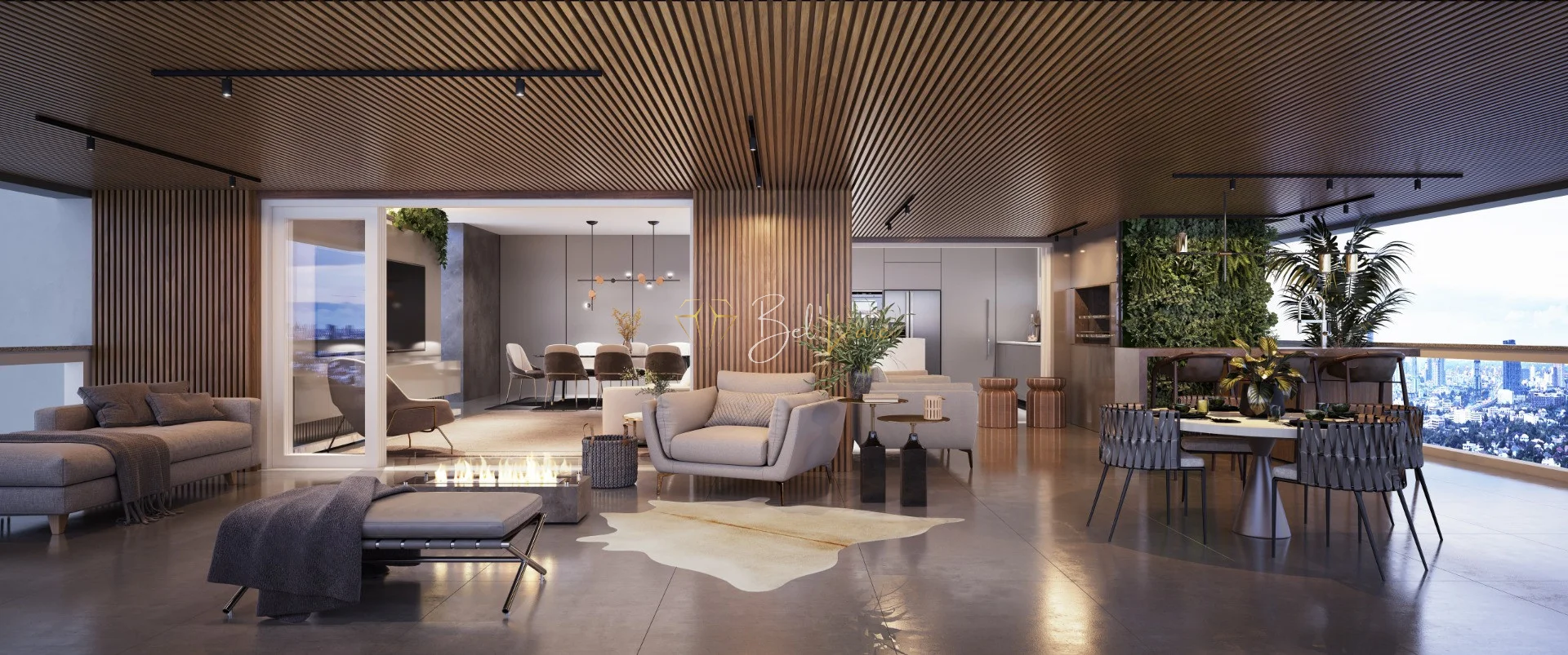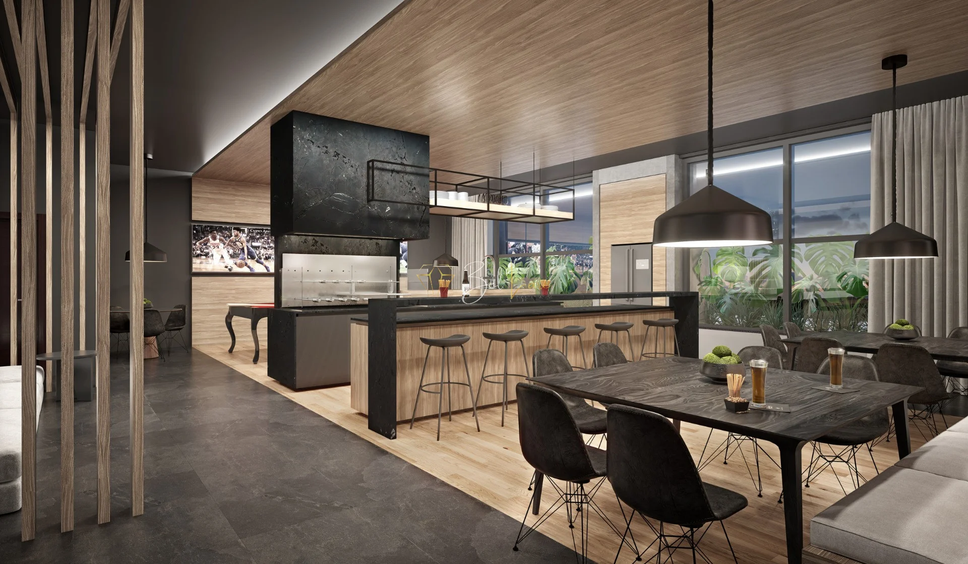 O apartamento dispõe de três suítes, sendo uma suíte master com closet, living envidraçado com estar e jantar integrados, cozinha com churrasqueira integrada à área social e uma ampla sacada gourmet com 39m², ideal para momentos de convivência. A área de serviço é independente e conta com sacada de apoio, além de lavabo.