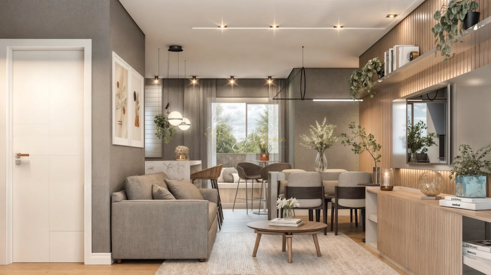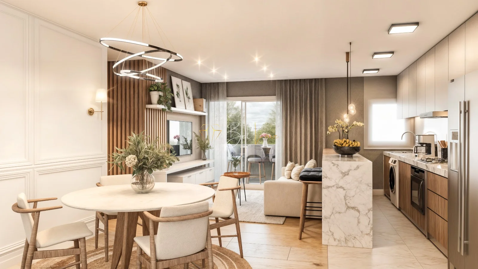 Apartamentos com metragens de 55m² a 78m², distribuídos em plantas inteligentes de 2 dormitórios, com opções que incluem suíte e lavabo. Os ambientes sociais contam com cozinha e sala de estar integrados, proporcionando maior funcionalidade e conforto. As unidades possuem 1 ou 2 vagas de garagem.